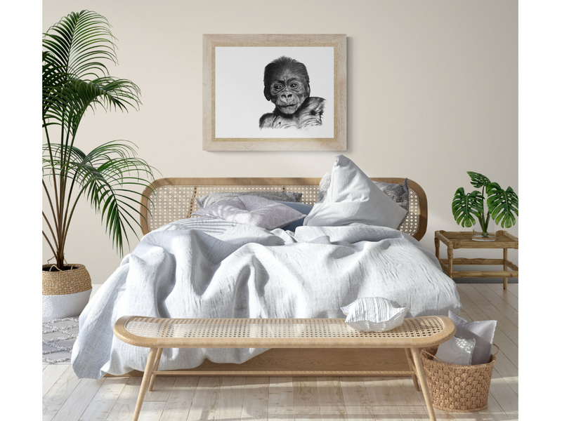 This charcoal portrait immortalizes a very young gorilla, capturing all the gentleness and vulnerability of its first moments. Its curious, delicate expression reflects the innocence of young primates.