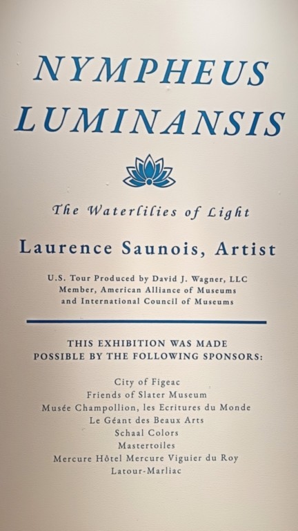 The Slater Memorial Museum, located in Norwich, Connecticut, hosted the American premiere of the exhibition Nympheus Luminansis, les Nymphéas de la Lumière (Nympheus Luminansis, Water Lilies of Light). This event marks an important milestone in the international presentation of this artistic project, which has been developed over several years.