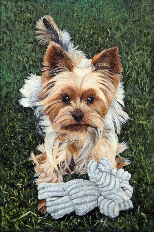 La cliente de l'artiste peintre voulait que sa chienne Yorkshire Terrier soit représentée couchée dans l'herbe avec un de ses jouets. Elle voulait mettre en avant le caractère joyeux et vif de sa chienne.