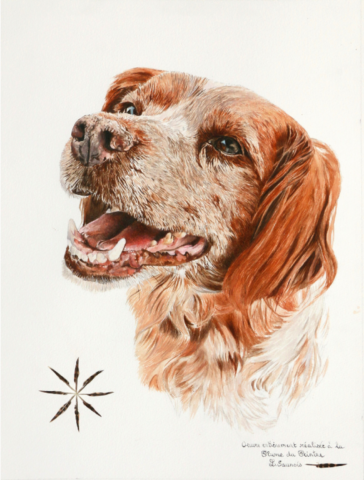 LocaDRAWING OF A BRETON SPANIEL ENTIRELY CREATED WITH WOODCOCK FEATHERS BY LAURENCE SAUNOIS, ANIMAL ARTIST