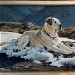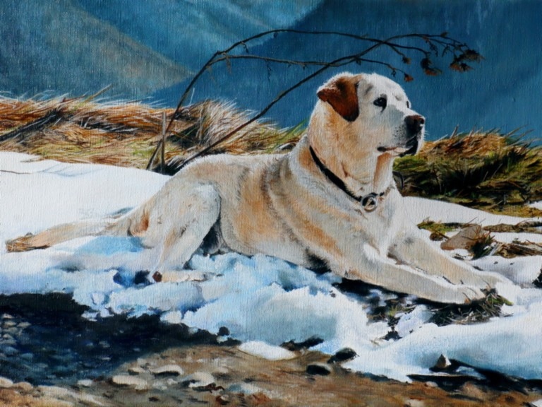 Oil painting of a yellow Labrador retriever resting in the snow
